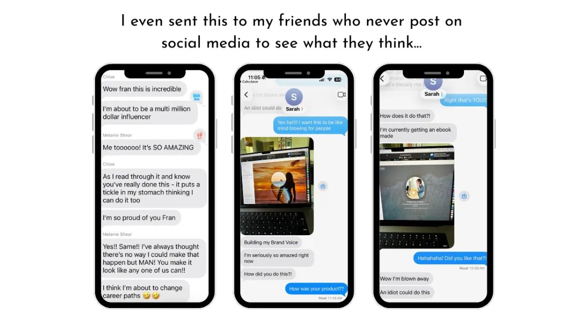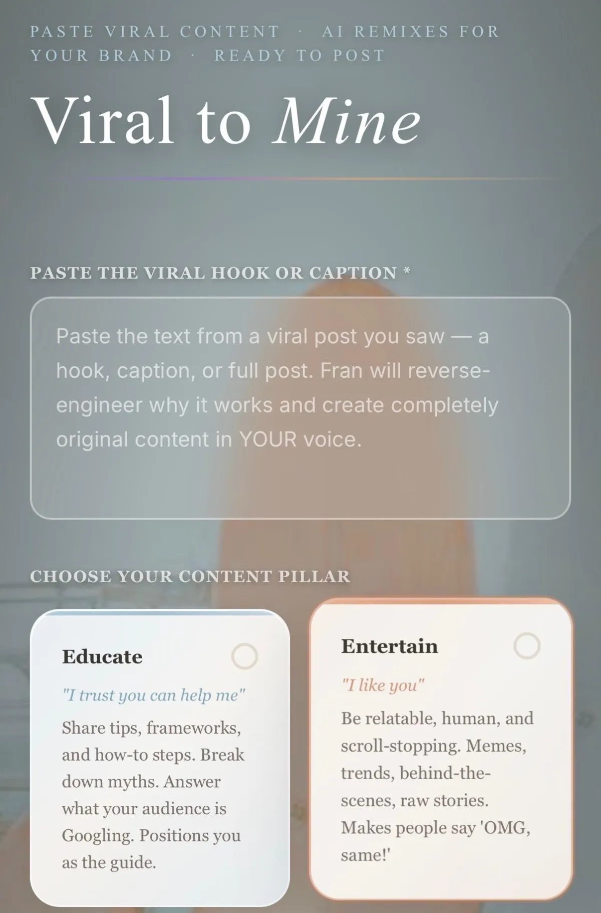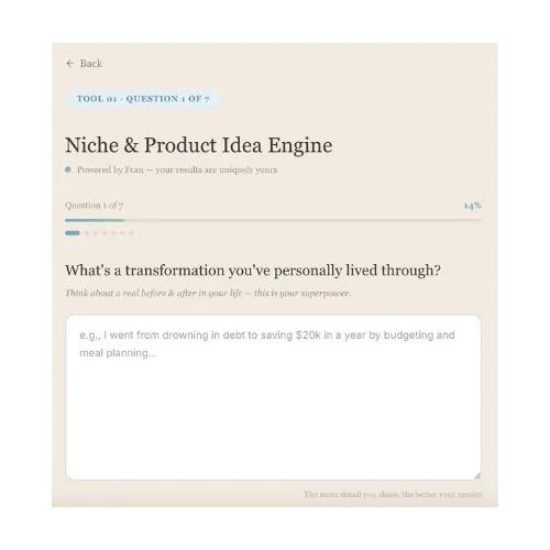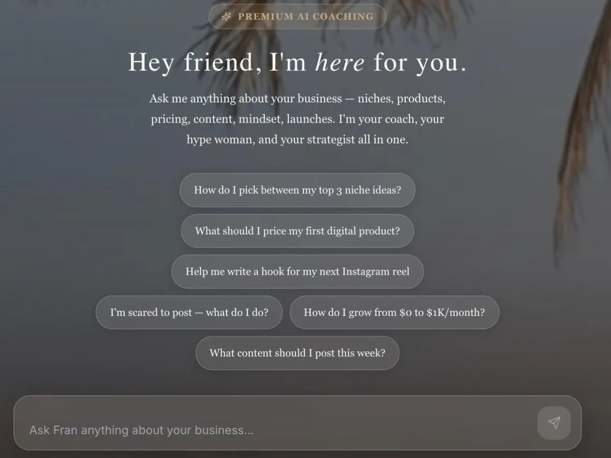 Fran packed her multi-7-figure playbook into this affordable AI platform. It helps you nail your niche, build digital products fast, and create authentic content that actually converts…all while staying true to your voice.