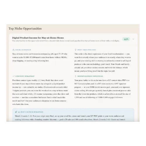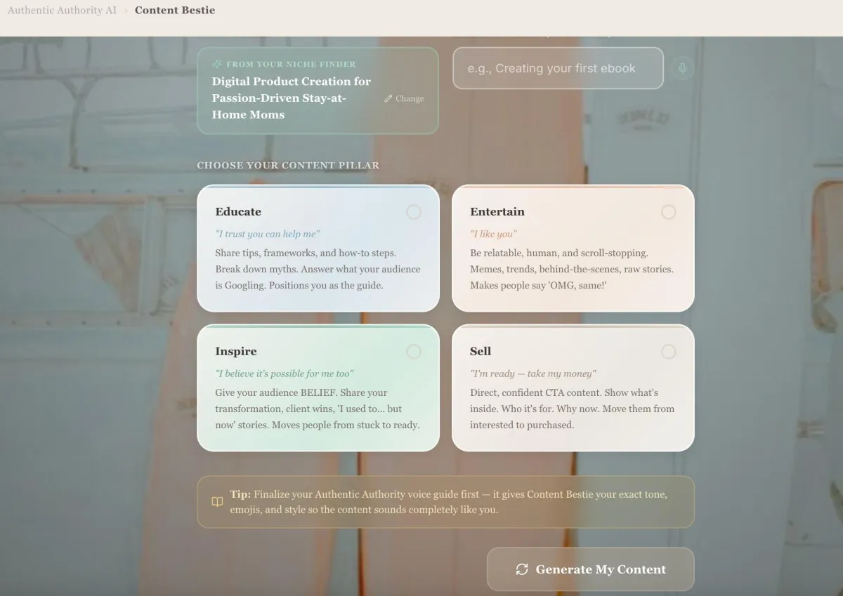 Authentic Authority AI helps you discover your niche and positioning first. The platform analyzes your experience, interests, and expertise to generate a clear niche and digital product direction you can build around.