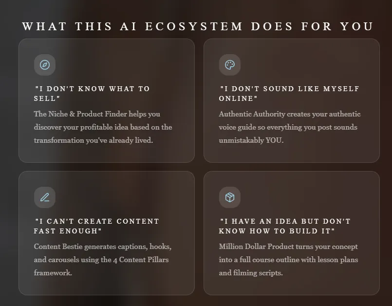 Authentic Authority AI generates hooks, captions, and carousel frameworks based on the same messaging systems that generated millions in digital product sales.