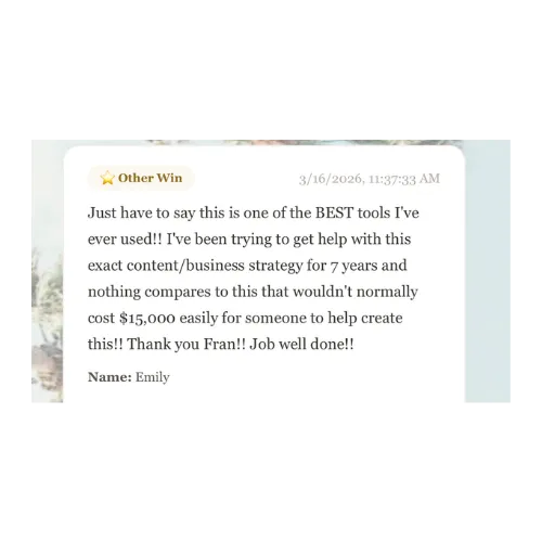 Just have to say this is one of the BEST tools I've ever used!! I've been trying to get help with this exact content/business strategy for 7 years and nothing compares to this that wouldn't normally cost $15,000 easily for someone to help create this!! Thank you Fran!! Job well done!! ~Emily
